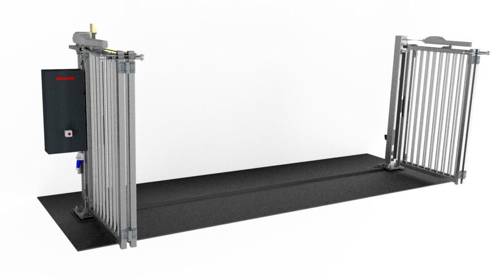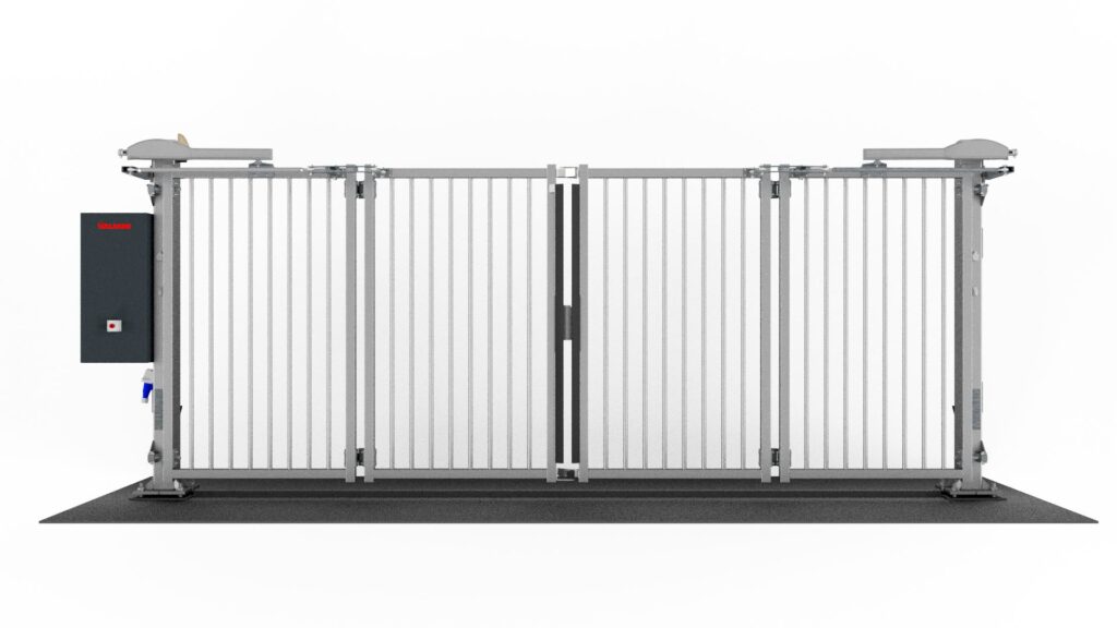 meter per second allows the gate to fully open or close in less than 10 seconds. The gates opens inwards as standard. Once closed, the gate is locked by a magnetic lock and self-braking motorization.